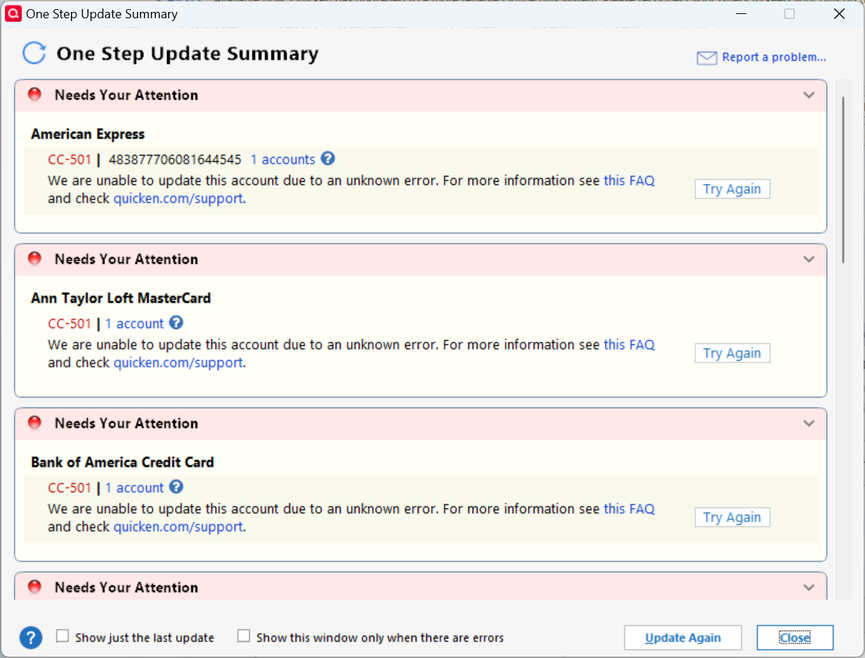 Regardless of what is going on with Everbank and their issues, there should be no reason for Quicken to error out on the other financial institutions. This should be easily correctable by Quicken. I reported this problem through Quicken, and sent the log files. They should be able to easily reproduce this issue at will, and find the root cause of the bug.