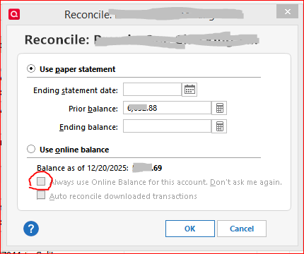If you decide to reconcile using online balance, please review the two settings under this selection. You may want to uncheck the setting "Always use online balance … Do not ask me again" to get your prompt back0