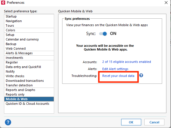 The next step, in case the problem is being caused by outdated information in the Quicken Cloud, is to reset the cloud. To do that, navigate to Edit>Preferences>Mobile & Web. Click the blue "Reset your cloud data" link.