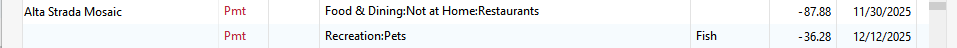 I never entered a transaction for Alta Strada with the category of Pets. I confirmed there is no such posting by doing a Find. There is a 36.28 transaction for Pets but the Payee is Amazon.