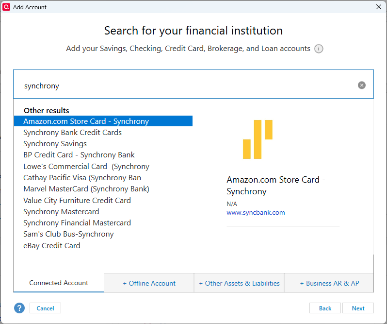 I have a Synchrony Car Care Account. I could not find this listed as an account option on Quicken. Is this account option not available for online access?