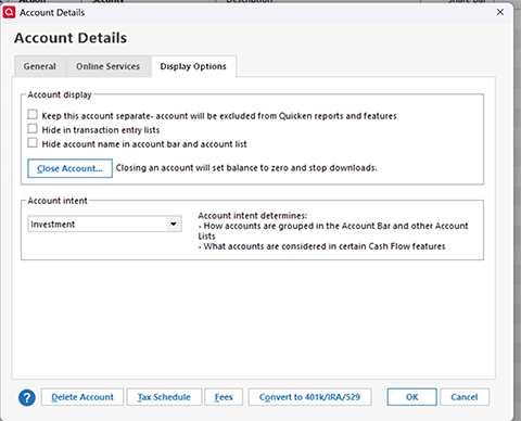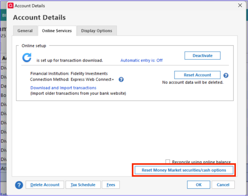 Once the account is added as new, navigate to Tools>Account List, click the Edit button next to the newly added account, select the Online Service tab, and check to see if the Reset Money Market securities/cash options button is present.