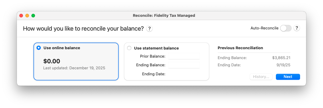However, the Reconciliation process for two of my Fidelity managed accounts still fails to show anything but a zero online balance.