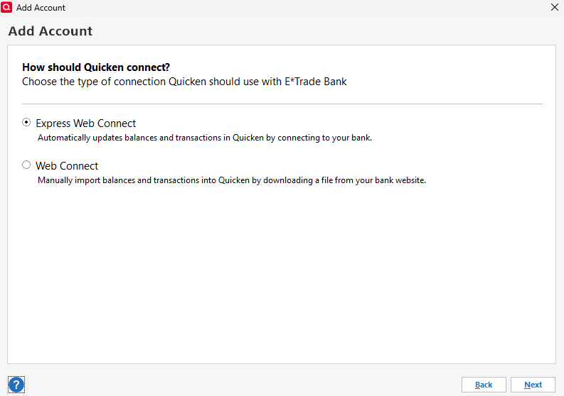 Thank you for reaching out! To change from Direct Connect (DC) to Express Web Connect (EWC), first, backup your Quicken file. Then, deactivate the accounts you want to switch to the other connection method. Once the accounts are disconnected, navigate to Tools>Add Account and search for the financial institution you wish to connect to. Click to highlight the financial institution, then, if you see the option, click on the blue Advanced Options link.