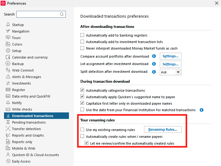 Once you have checked there, please click the Renaming Rules… button and verify that there are no overly general rules which may be causing the problems with incorrect payees.
