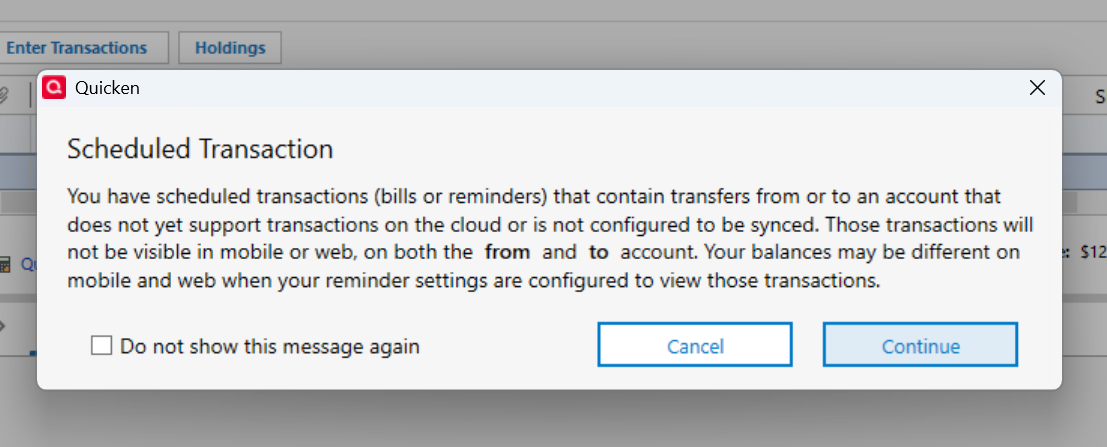 When doing cloud synch, this cryptic warning message will pop up. It would be nice if there was a "Details" tab that would explain which bills or reminders are not supported.