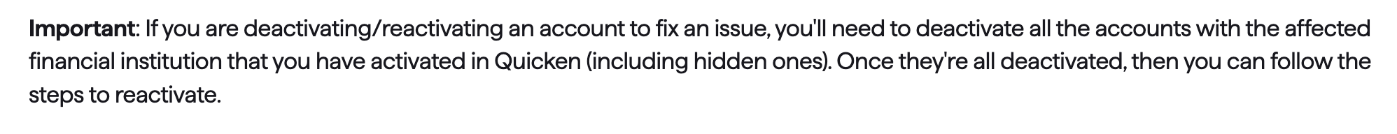 - Important: If you are deactivating/reactivating an account to fix an issue, you'll need to deactivate all the accounts with the affected financial institution that you have activated in Quicken (including hidden ones). Once they're all deactivated, then you can follow the steps to reactivate.