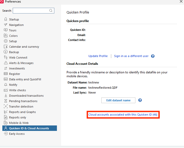 - Click Cloud accounts associated with this Quicken ID (#) (this is not a button, it is written in blue underneath the "Edit dataset name" button)
