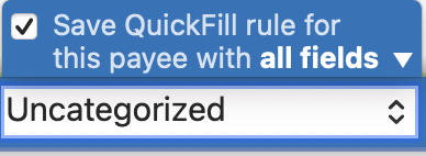 This combination of the global setting and the pre-transaction setting gives users ultimate control over whether QuickFill rules should be created and whether a QuickFill rule is category-only or all fields.