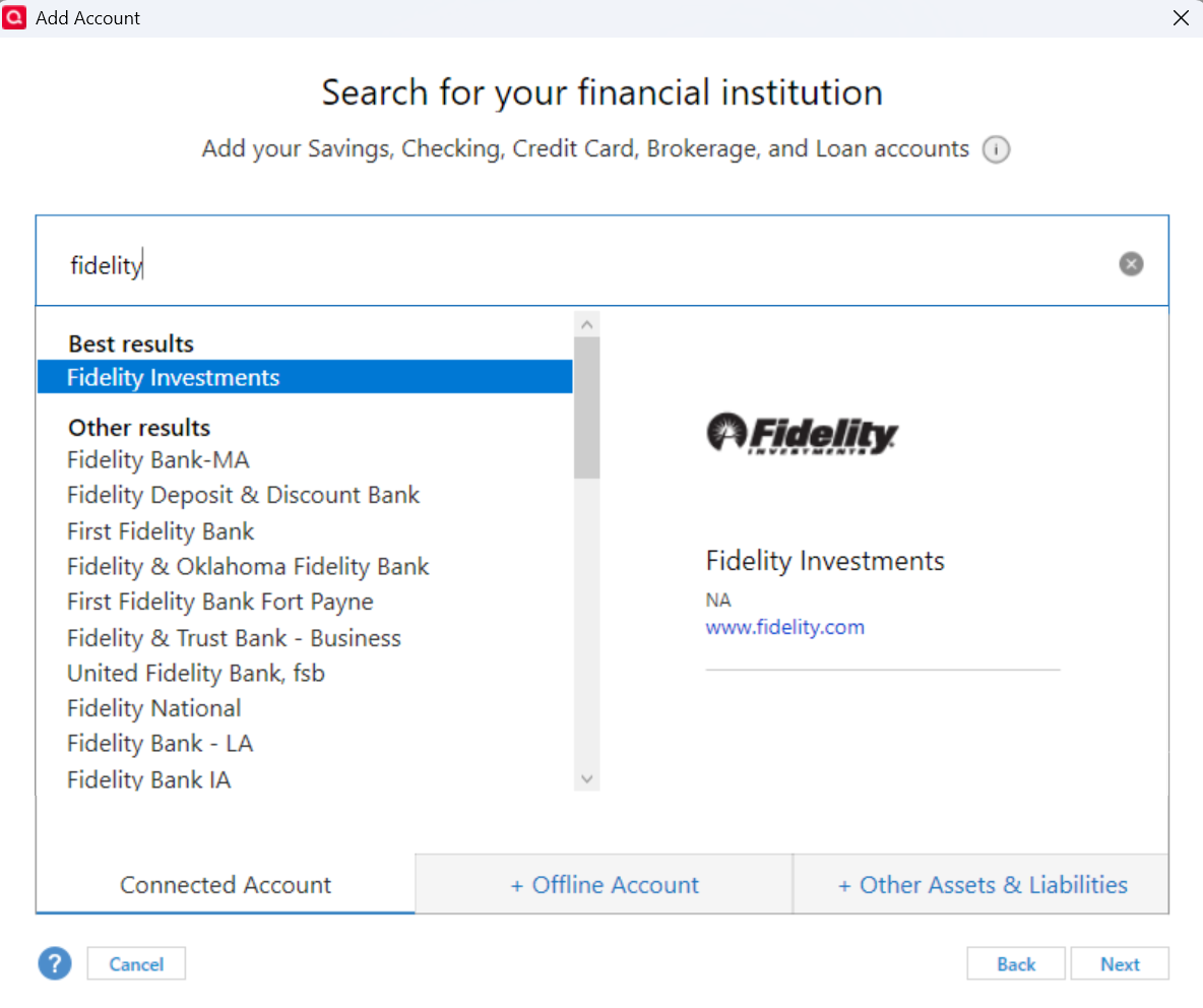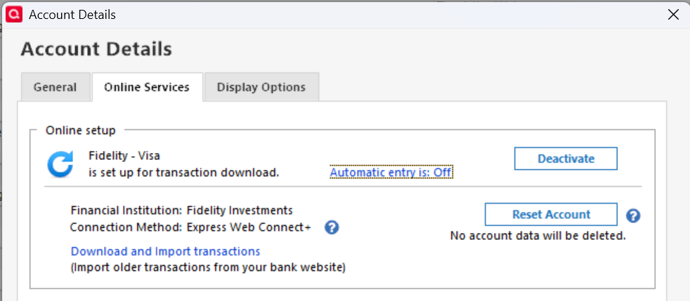 • Using the Fidelity connection you may be a day or two out of sync vs. the latest on Elan. This is only an issue when it is time to reconcile after the monthly statement comes out.