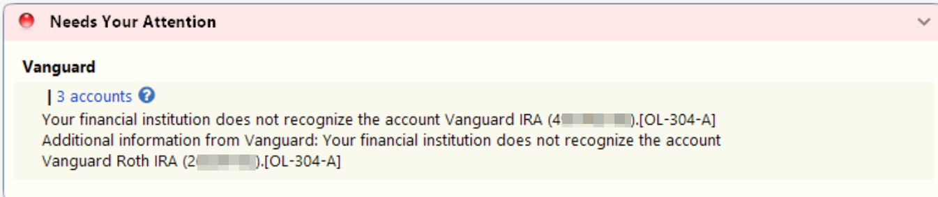 If the IRA accounts still do not appear during setup after confirming they are authorized on Vanguard’s end, you’ll need to contact Vanguard directly, as OL-304 errors originate from the financial institution’s side.