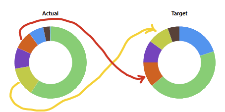 This has been an issue since at least 2018. For the Target allocation, the doughnut slices are in the same order as the allocation chart, going clockwise from 12:00. The slices in the Actual chart are also clockwise starting from 12:00, but they are in largest to smallest order.