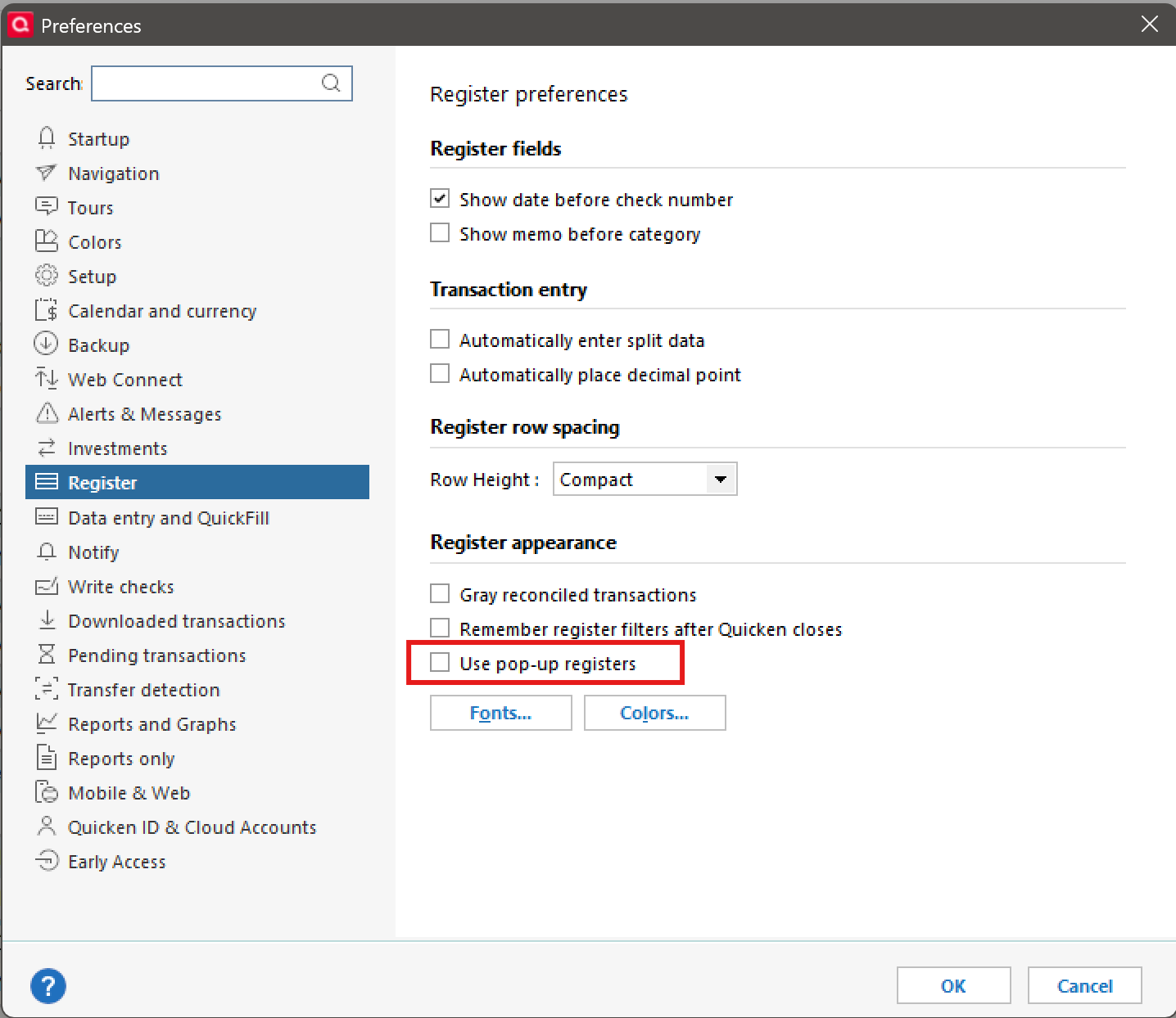 Not sure how you have the registers set up - there is not much to control, but you can check to see that you do not have pop-up registers checked.
