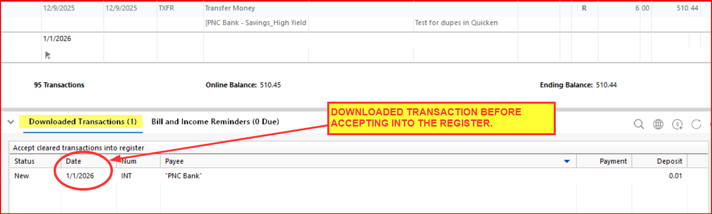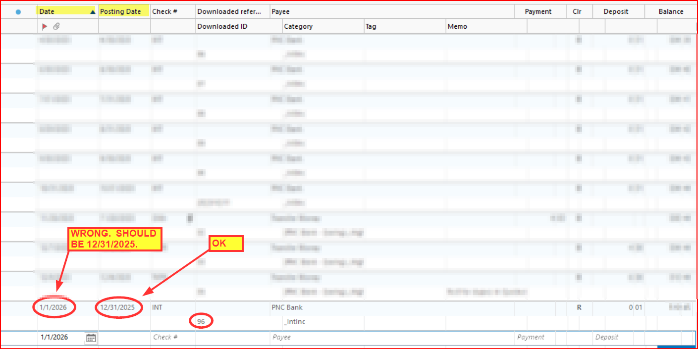 When running OSU this morning, my PNC Bank savings accounts downloaded 12/31/2025 interest deposits with the transaction date being 1/1/2026 but with the posting date being 12/31/2025. See the following pics from one of the accounts.