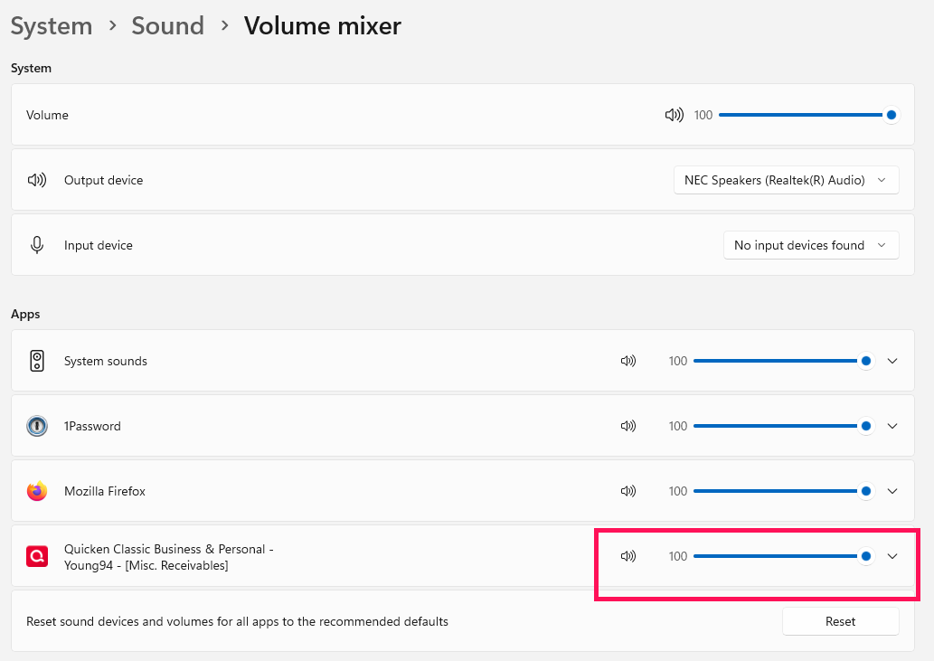 Thanks Tom. I had tried Volume Mixer before my post, but it did not work initially because the Quicken app did not show on the list of apps. Little did I know that the Quicken app has to be open to appear on the Volume Mixer page. This I finally discovered by accident, so the problem has been fixed (after a lot of wasted time). Thanks again Tom, and no thanks to Quicken or Microsoft.