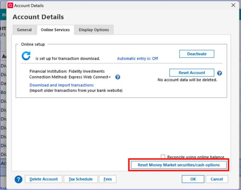 I don't have a 'Reset Money Market securities/cash options.