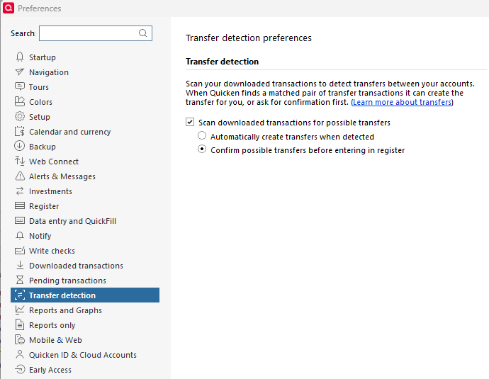 With these settings, when Quicken "thinks" something might be a transfer (correct or not), you will be presented with a pop-up to accept or decline. This will put the control in your hands.2. Transfer deletion: I see your valid point and perhaps this should be an enhancement to the product where when I delete a transfer on one side, Quicken will [optionally] ask if I want the other linked transaction to be deleted as well or not. And this option can be managed in the Preferences (maybe somewhere in the image above in a variety of ways). If you create a New Idea post I'd support it and maybe other users will add to it as well - everyone benefits.