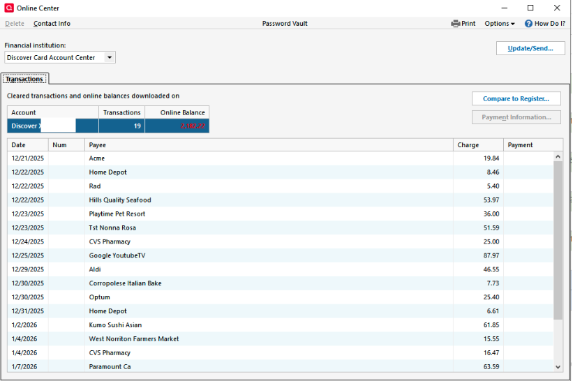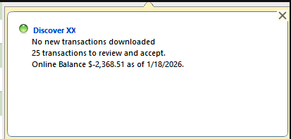 Thanks. Just went thru updating my Discover card, but my transactions are still not going into the register. Same with my 2 PNC accounts. There's got to be more to this. Thanks for your help.