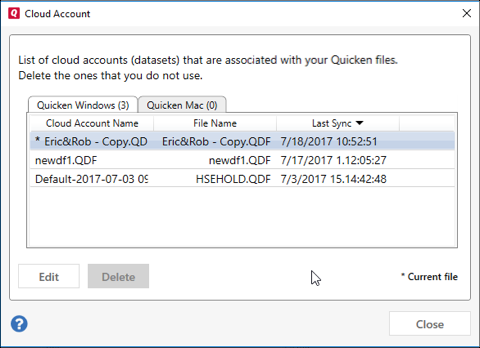 To clarify, I am referring to deleting the cloud accounts, not your actual Quicken account. Each Quicken file has a cloud account associated with it unless you had Sync turned off when you created the file.