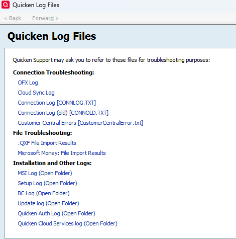 You can also view log files by navigating to Help>Report a Problem. The Include Quicken log files section has links you can click on to view the logs which are sent with problem reports by default. The QCS log is the one most likely to have the information you want to review.