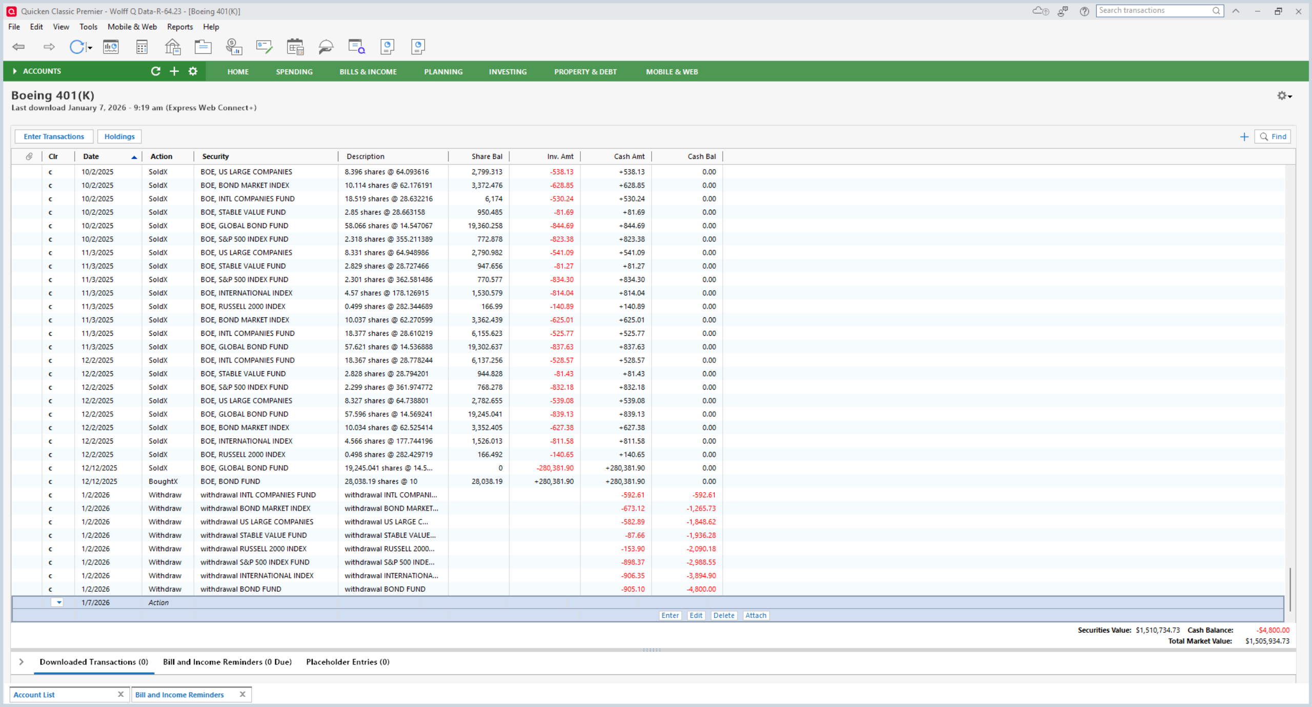Prior to this fall, withdrawal requests from my 401k held by Fidelity Net Benefits used to be recorded in the 401k register as "SoldX" transactions that reduced the total share counts of the affected securities, as one would expect. But since Fidelity changed to the new EWC+ connection method sometime this fall, new withdrawals are recorded as simple "Withdrawal" transactions in the investment register which leave the share quantities unaffected.