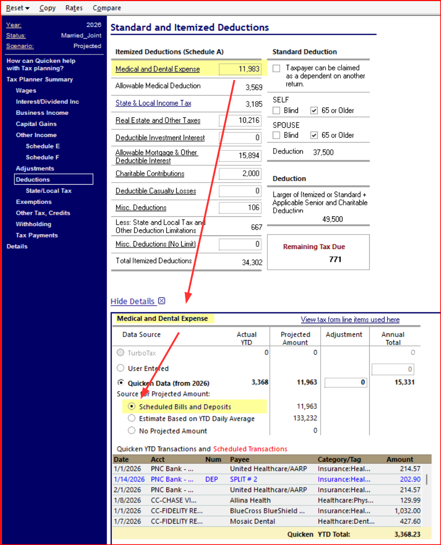 You may want to review the details for each income/expense section in the 2026 Tax Planner to make sure they are set to import the scheduled bills and deposits. If sounds like you might not have done this, yet. This is an exercise that usually needs to be made every year when first working with the new year's plan. Here is a picture showing what I mean by this: