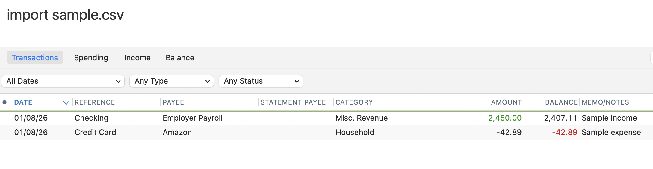 - If you're using the sample file, after entering your data, delete the first row with the column heading instructions. (If you don't, Quicken should warn you the row didn't import, but still process the other rows.)