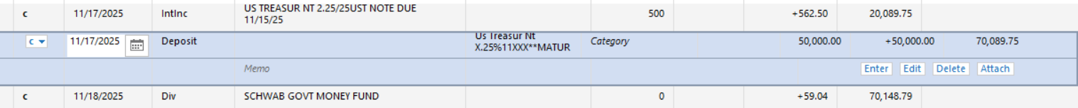 ok, so i am used to bond redmption issues where i need to change a deposit to a sale to remove the bond from the holdings. I had a US treasuries redemption - i see the deposit, but it appears the holding were removed in Q. I don't see A quicken transaction that would do that. And, I am at a loss at how to categorize the deposit.