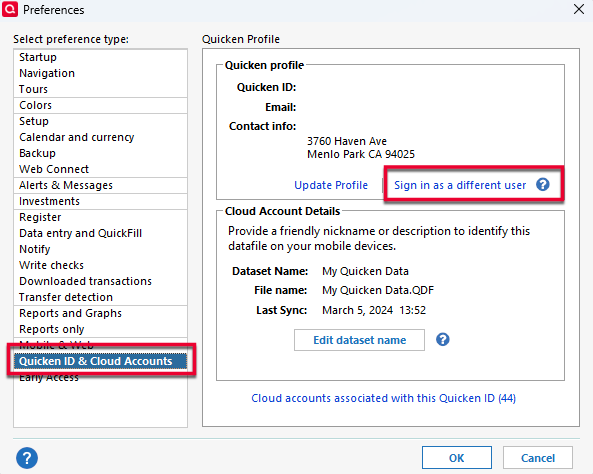 - In the left panel, select Quicken ID & Cloud Accounts.