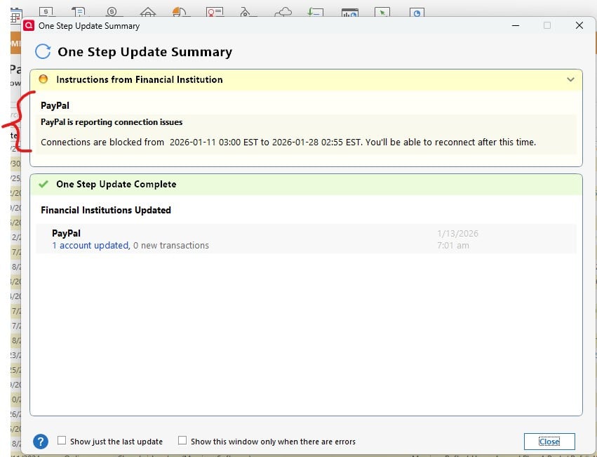 - During or after these changes, Quicken can lose authorization for your PayPal account, and instead of a clear “reauthorize PayPal” error, it sometimes surfaces this blocked‑connection message in One Step Update.[3][2]