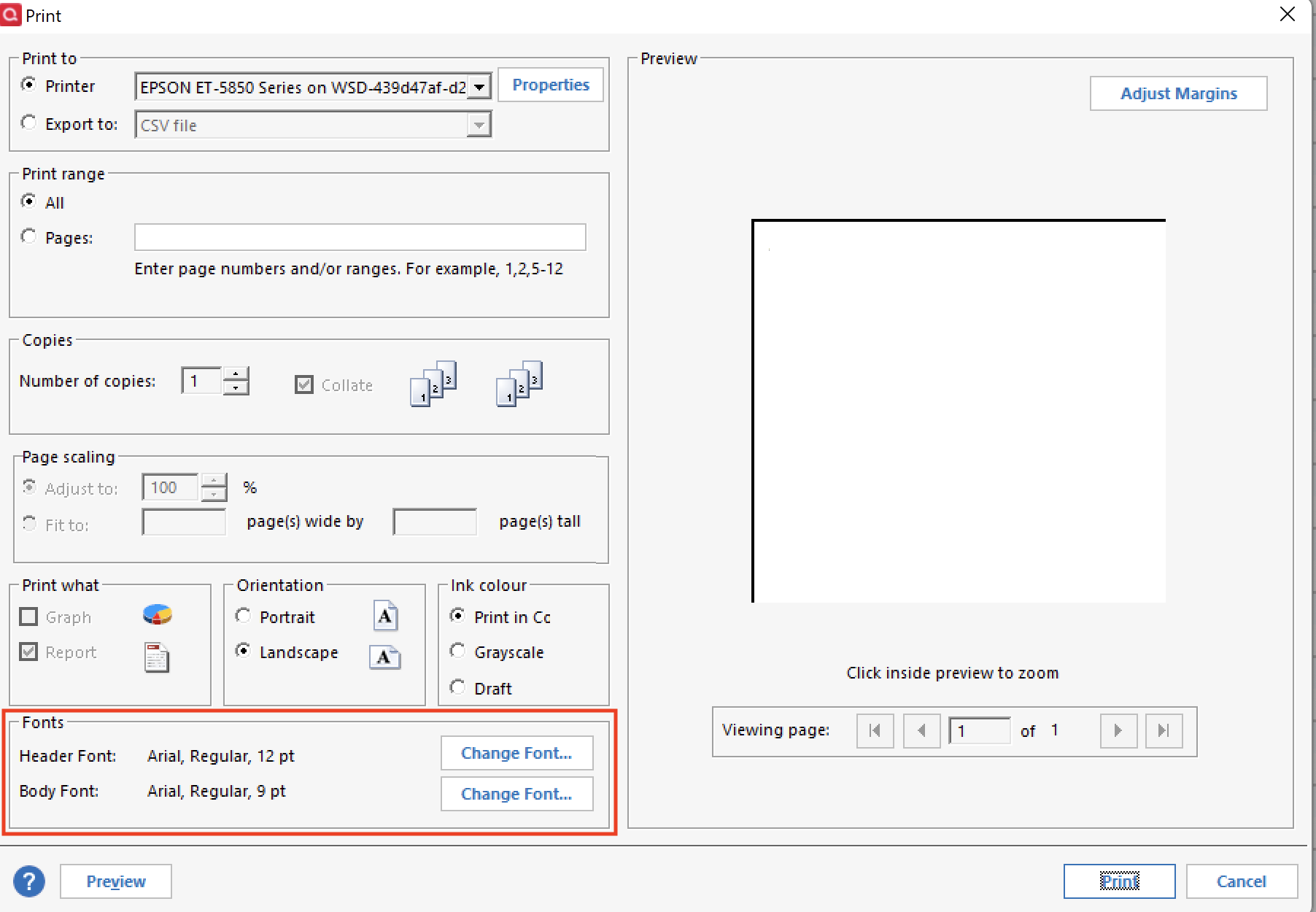 When printing from Quicken for Mac, it would be very convenient to be able to select at least the font size. If not dynamically in the print dialog, at least in some "Page Setup" for a default selection. This screenshot from Quicken for Windows. The controls in the area "Fonts" would work well for us. Of course, when the font is smaller, I would expect wider columns with less wrapping of long strings. The current implementation is especially bad because each printed column width appears to be the same, not proportional to their width in the on-screen register window. Are the Mac engineers able to offer something similar to Windows?