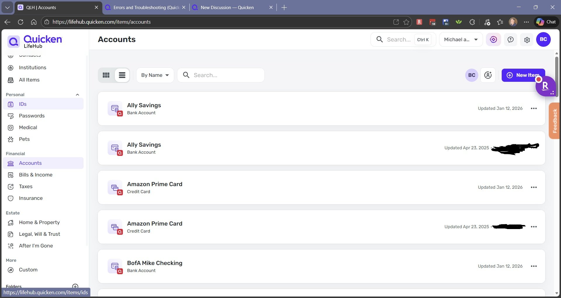 If you still have duplicate entries, you should delete them manually. In the future, if your accounts are not updating, you can try resending the information to Quicken LifeHub from Quicken before having to delete everything.