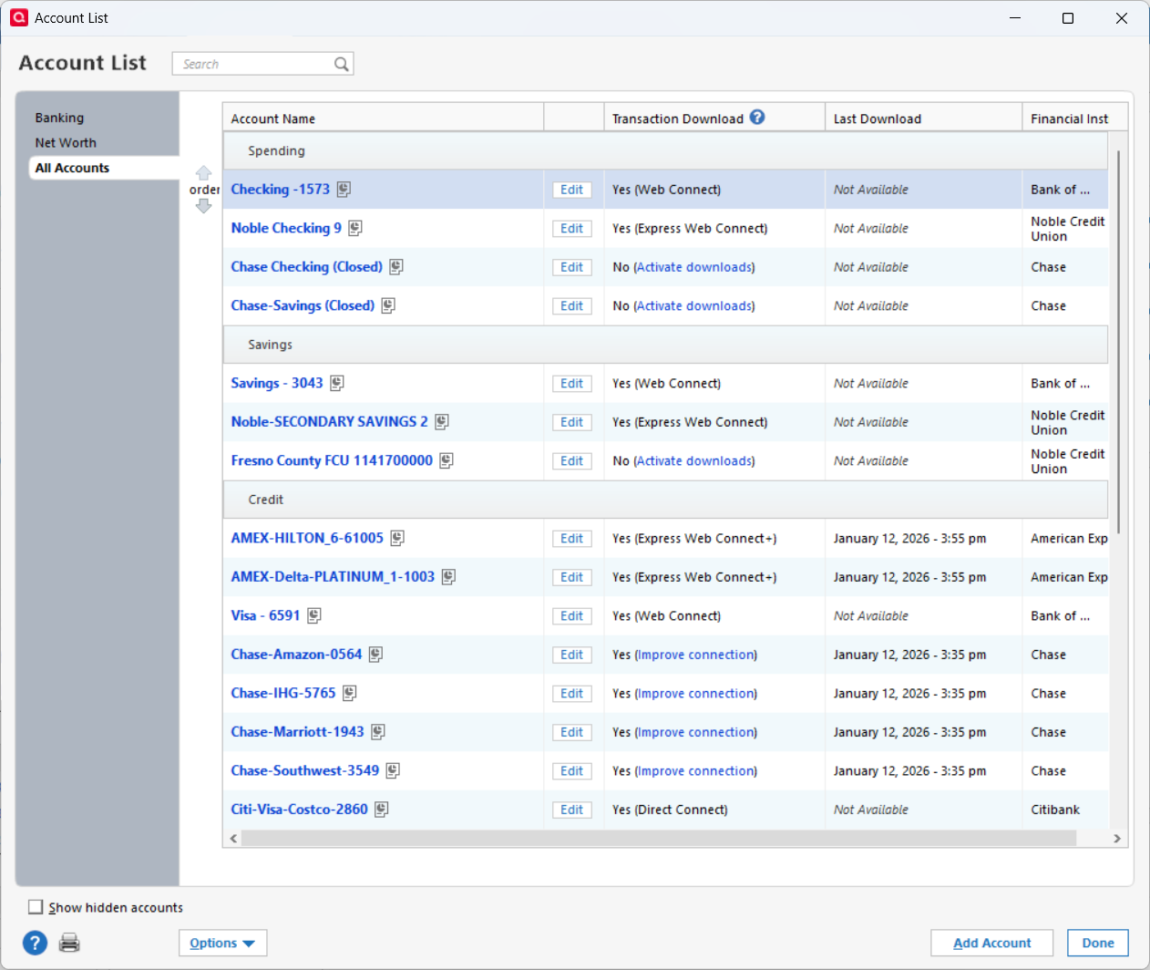 I cannot express enough how my I appreciate you taking the time to answer my questions. I figured out the cut/paste thing. It's kind of scary because my accounts go back to 2007. Maybe the best thing for me to do is to start fresh with the new accounts that get downloaded using One Step. I think only one year (12 months) of transactions will download into Quicken. I am trying to work on my 2025 taxes and I will have to do whatever is necessary to get my bank data.