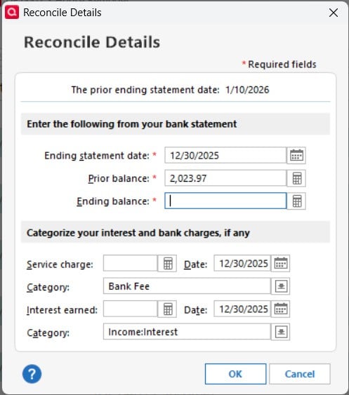 The fact that this window decides to display 12/30/2025 is extremely annoying. The (apparent) reason that the window displays 12/30/2025 is because the previously performed reconciliation was for 11/30/2025.