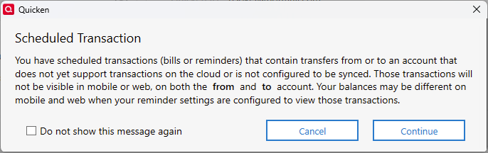 That message typically means that you have one or more bill or income reminders which impact an account that either does not support transactions in Quicken on the Web (such as investment accounts) or an account that you did not select to sync with the Quicken Cloud. The message ensures you're aware that any reminders impacting such accounts will not show up in Quicken on the Web and the Mobile app.