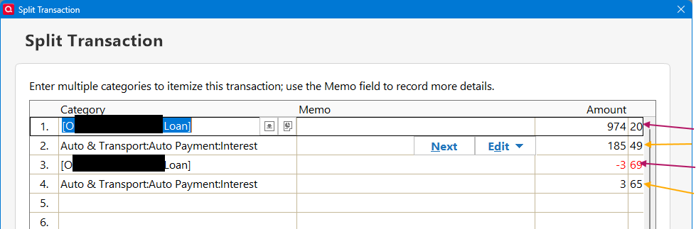 I then edit the added split lines of the Reminder to make the Principle and Interest match the bank's payment (Q doesn't allow me to change the first two split lines):