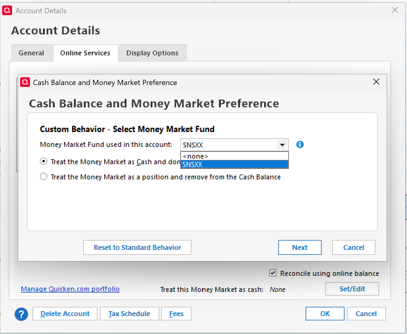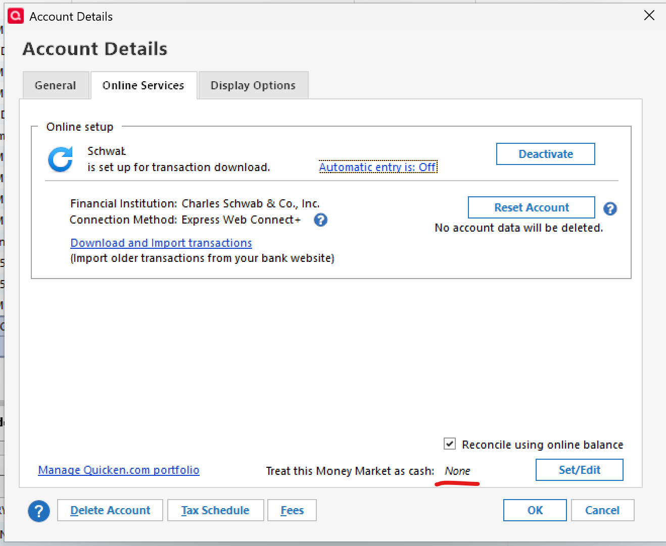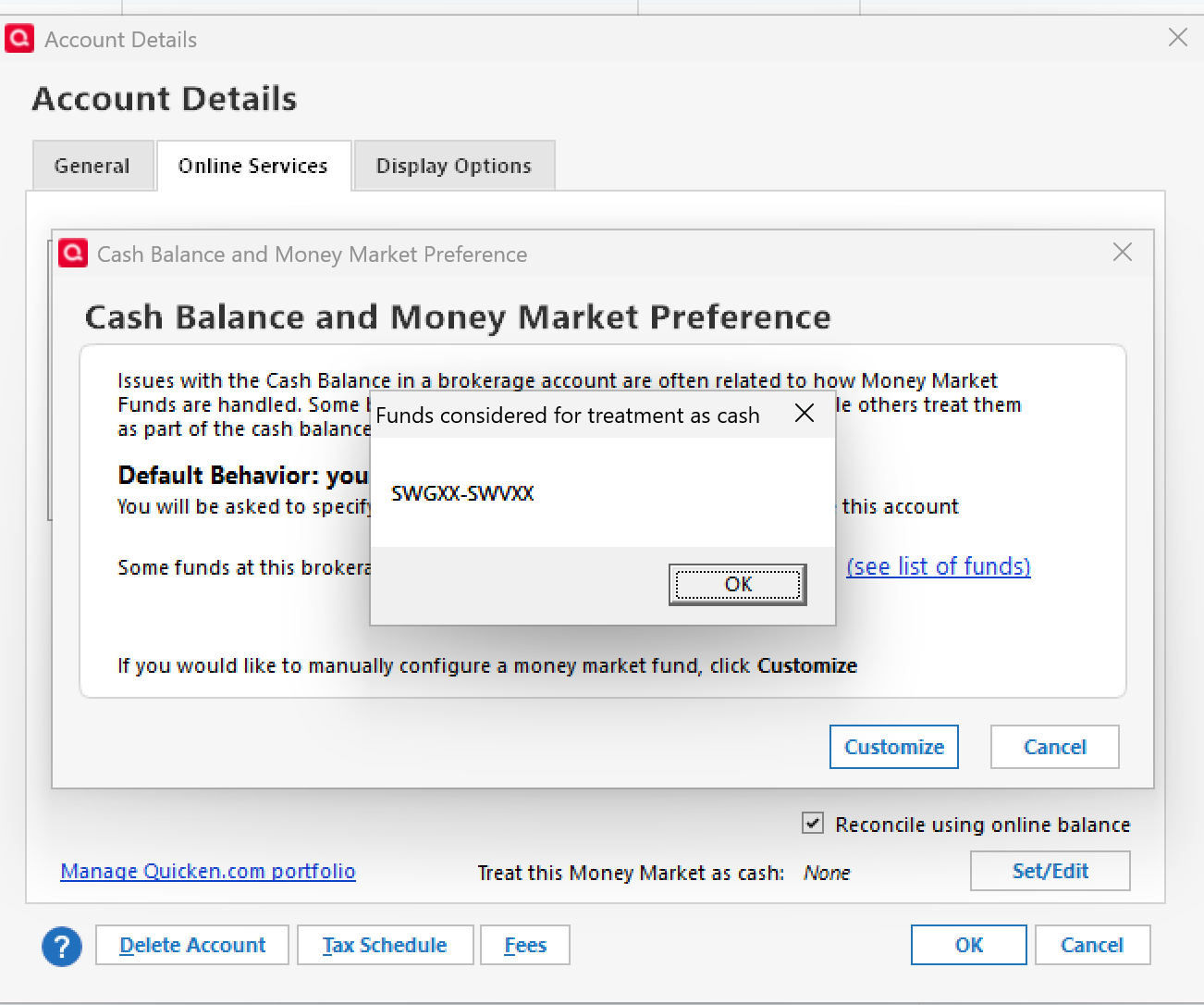 My Quicken Premier R65.29 downloads BUY and SALE for the SWGXX, as result my cash is $0.00, so I don't know what are available and I can't see it in the Projected Balances, as its very important for me. I use this brokerage account as my Checking account to pay bills and credit cards via ACH.