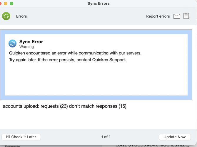 Why am I still getting a "Sync Error" warning with Quicken servers?