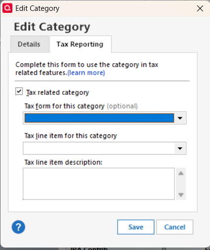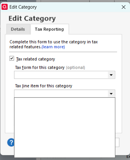 All tax line items for my categories are now blank. ("No tax line item assigned.") I cannot assign a tax item because the tax form and tax line item dropdowns do not populate when I try to edit the category.