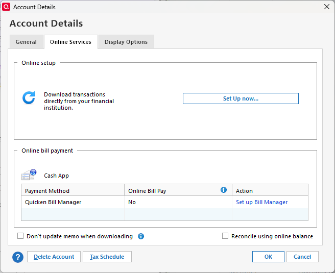 I don't think I would have been able to set it up as an online-connected account since Cash App is not listed.