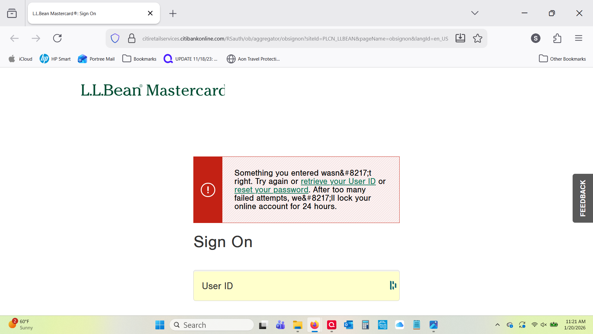 This takes me to the L.L. Bean Citi card site where my password is not accepted. (second screen shot)