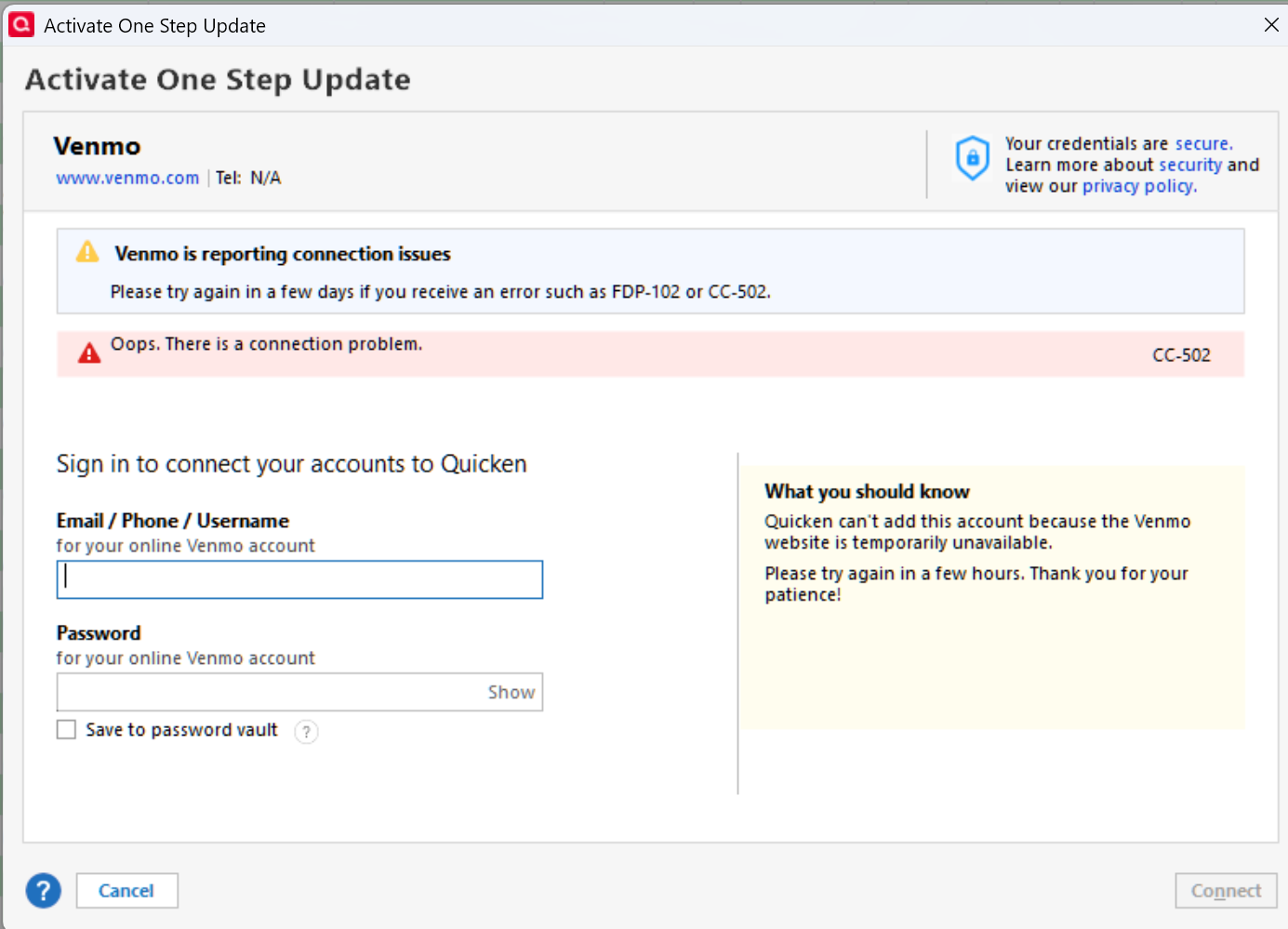 Quicken, what's going on here?! How long are you going to let this go on? Is this a Quicken problem, a Venmo problem, or do you have no idea?? At least give us some insight into the issue so we're not left wondering if this will ever get fixed.