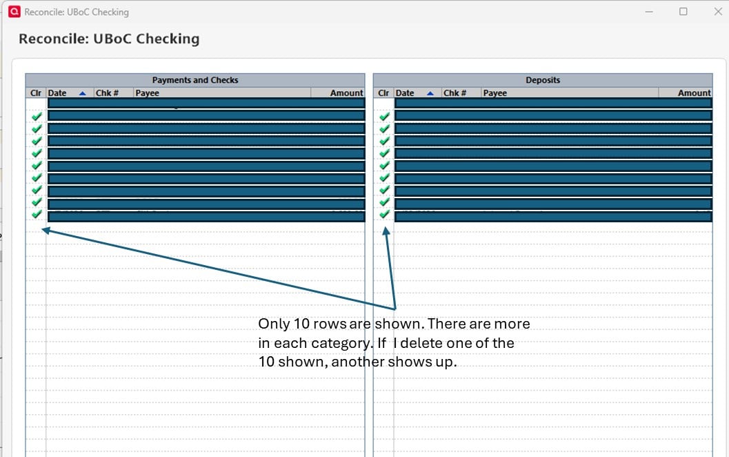 Both the "Payments and Checks" and "Deposits" list only show a maximum of 10 items. We're reconciling our statement, and both sections have more than 10 items, but adding any transactions beyond 10 don't show up. Do better.
