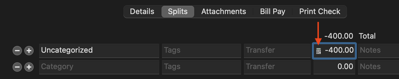 Unused Balance -73.51and you want to add a new split line for 8.93, then modify the unused balance line & reduce it by 8.93 and let Quicken add the new offsetting line which you can then categorize. If you don't want to do the math yourself you can press the little calculator symbol next to the Unused Balance number and use that to figure the new unused balance amount.