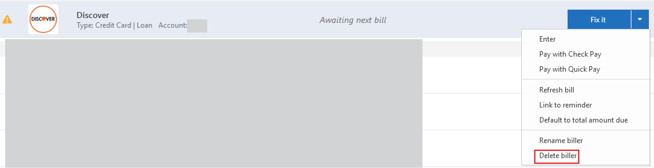 The first option would be deleting the biller and readding it. To do this, go to the Bills & Income tab. Click the dropdown arrow for this biller, and select Delete biller.