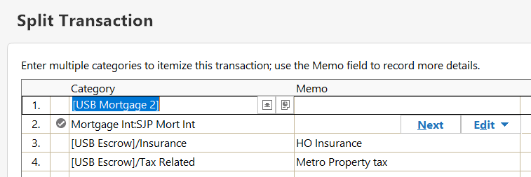 The Split transactions dialog should, AFAIK, not be broken up to include multiple entries for what needs to be paid out of an escrow account. The total monthly escrow withholding is entered as one Split line. When the mortgage company pays from escrow for tax, insurance, etc., separate transactions need to be recorded in your escrow account register.Split lines 1 and 2 are Quicken-calculated principal and interest amounts. Do not change.