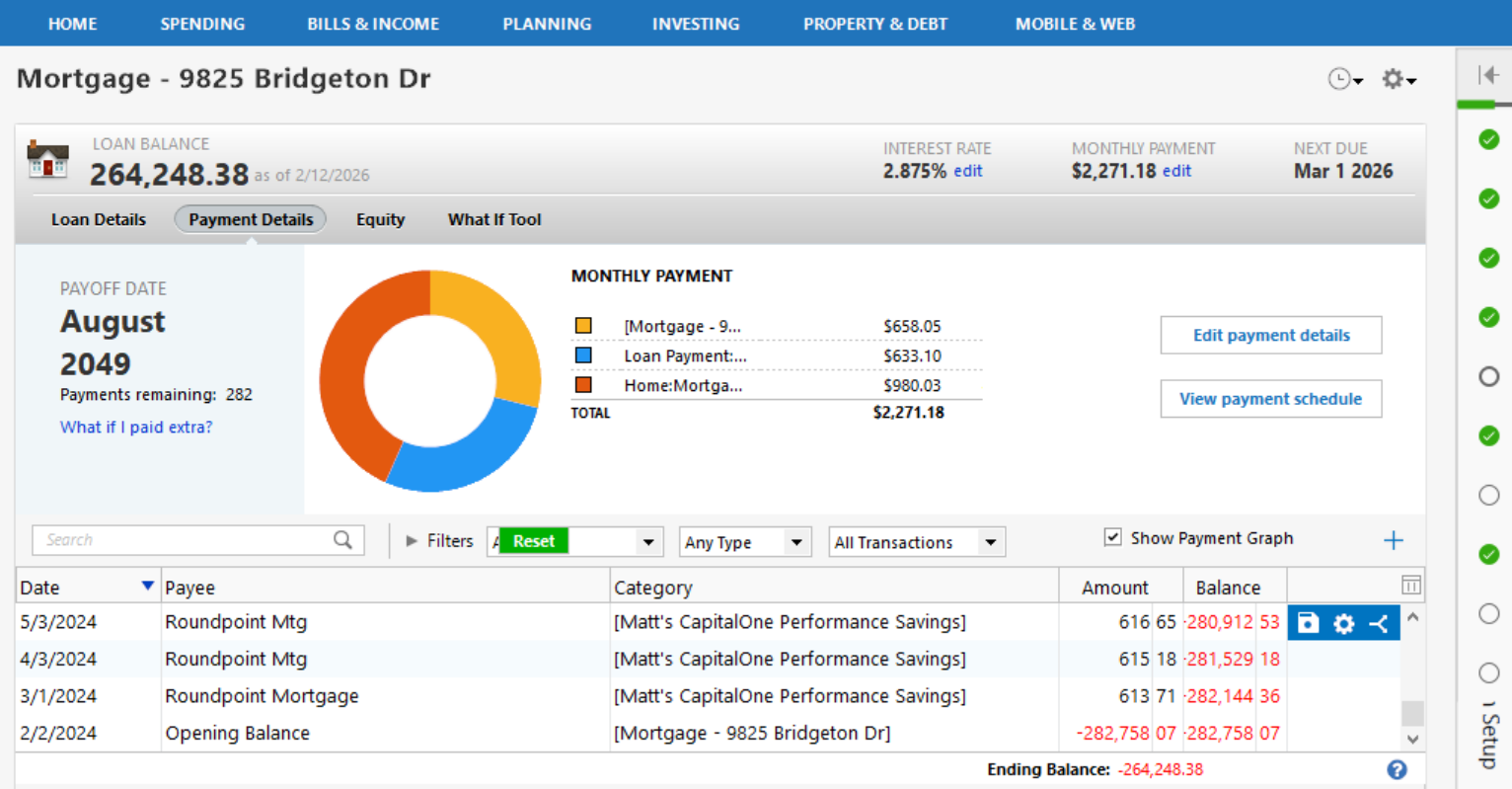 When I make a mortgage payment and I select the category as the Mortgage that I setup, the Loan itself does not update the "next due" date for payment. I must go into the loan and update the details for this to reflect.