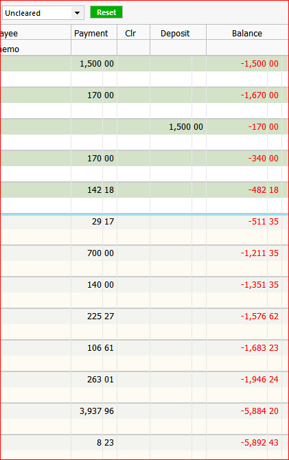 In this example, the register is filtered to only show Uncleared transactions. The Balance is a Running Balance of all transactions shown in the view, with the tally beginning at 0.00