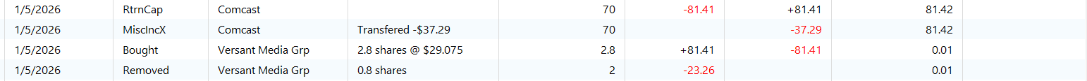 - Enter a RtrnCapX transaction for 1/5/26 with: the amount equal to that basis change, and the Market Value field = Versant shares times 40.57, closing VSNT price 1/5/26.