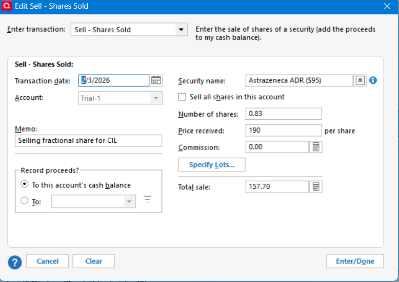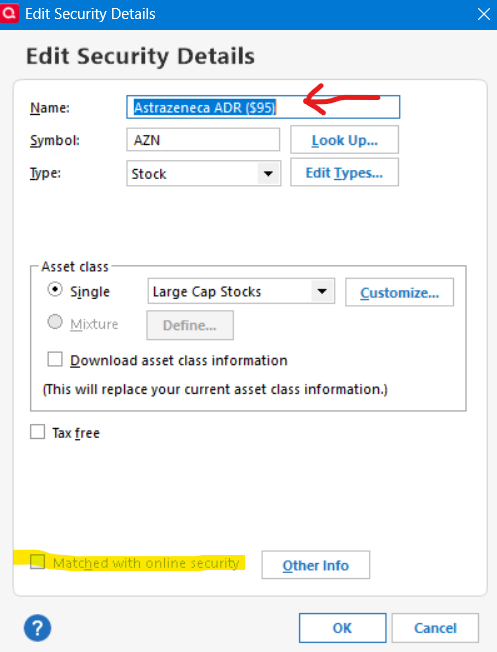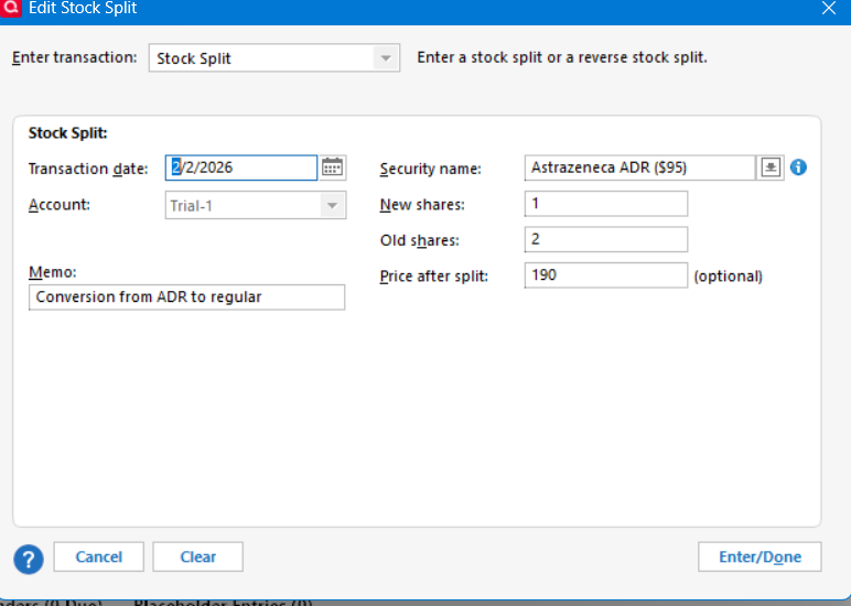 Quicken Holdings is now showing ARZ (Astrazeneca) Mis-match shares for the PLC….showing Quicken shows 83.66 shares…reported hares "0". That is an easy fix by using Update Share Balance to "0". Is there an easy fix to add/adjust replace…the ADR (which the share price is updating)…to get the Costs basis shown?